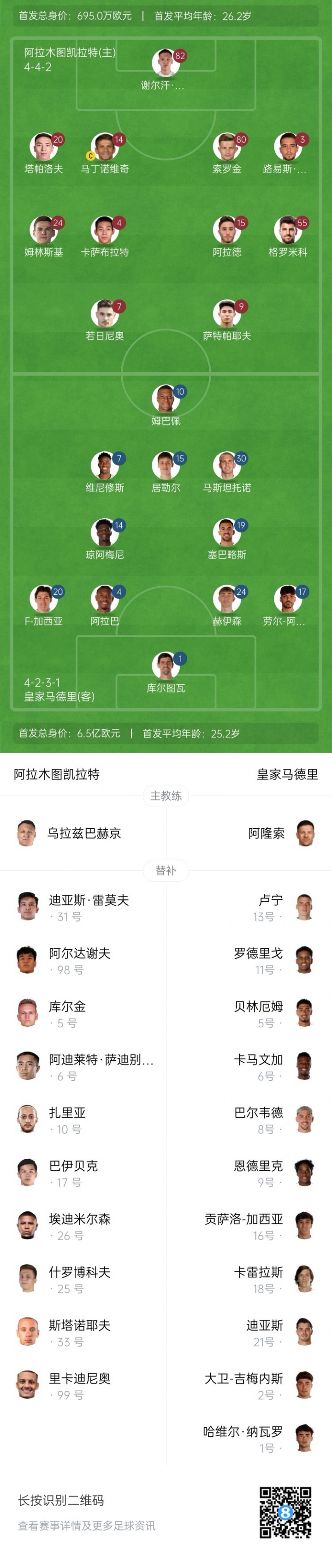 首发身价方面,皇马达到6.5亿欧,阿拉木图凯拉特首发身价695万欧,皇马是主队的93.5倍!
