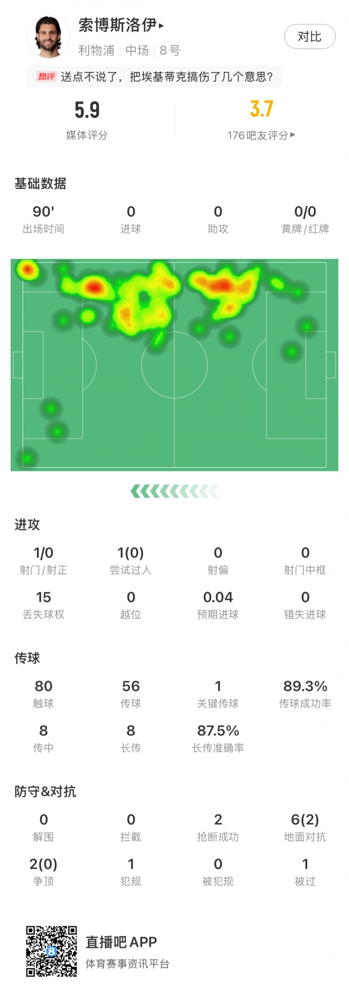 本场比赛索博斯洛伊1次射门无射正,1次过人未成功,56次传球1次关键传球,传球成功率89.3%,6次地面对抗2次成功,2次争顶无成功。