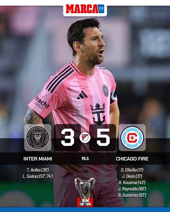 迈阿密国际冲冠阶段两轮不胜,1-1多伦多FC,3-5芝加哥火焰。