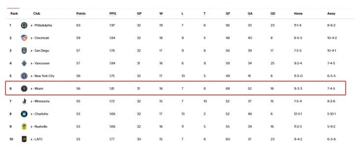 目前美职联东西区的常规赛总排名上,费城联32轮63分第一,迈阿密国际31轮56分排在第六。