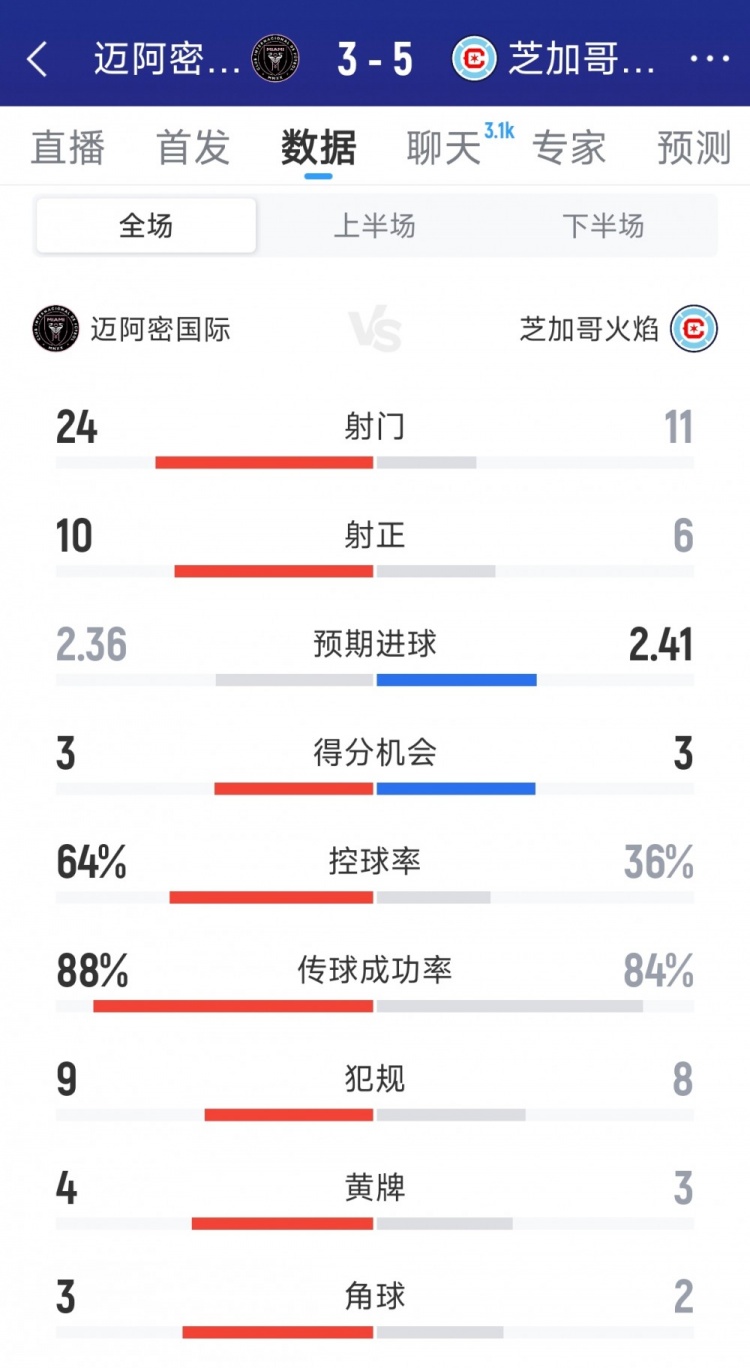 进球大战,迈阿密国际3-5芝加哥火焰数据:射门24-11,射正10-6