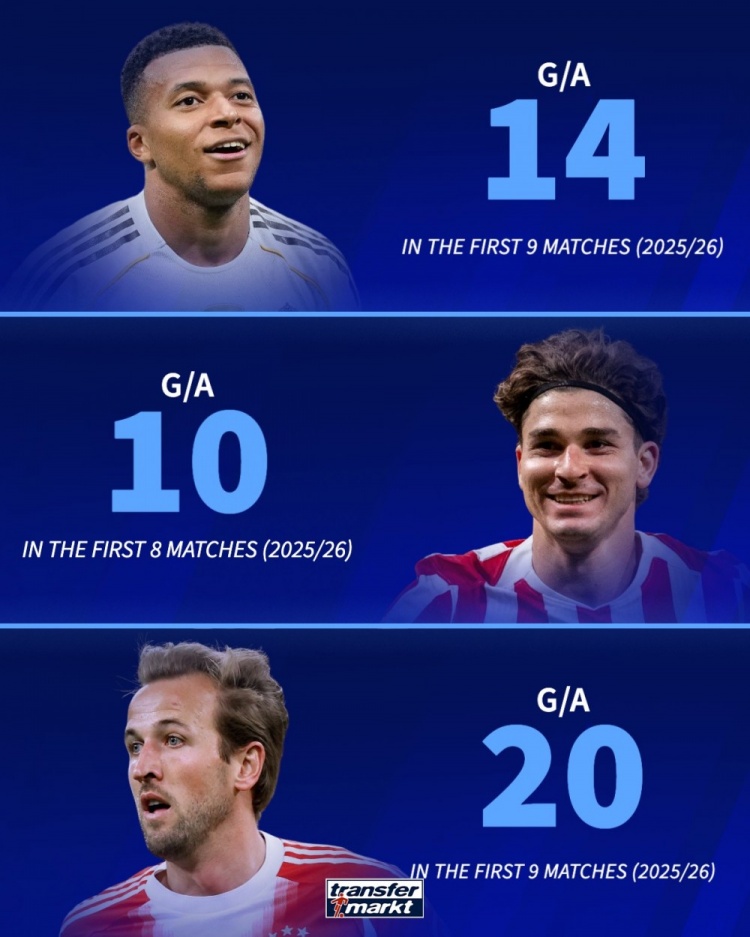 10月1日讯 德国转会市场列出凯恩、姆巴佩和阿尔瓦雷斯的进攻数据,将三人进行对比。