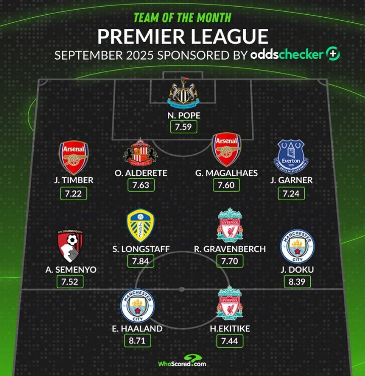 10月1日讯 数据网站Whoscored盘点了英超9月场均评分最高阵容,具体如下: