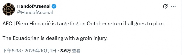 10月01日讯 据知名阿森纳博主HandöfArsenal消息,因卡皮耶腹股沟受伤,若一切顺利将于10月复出。