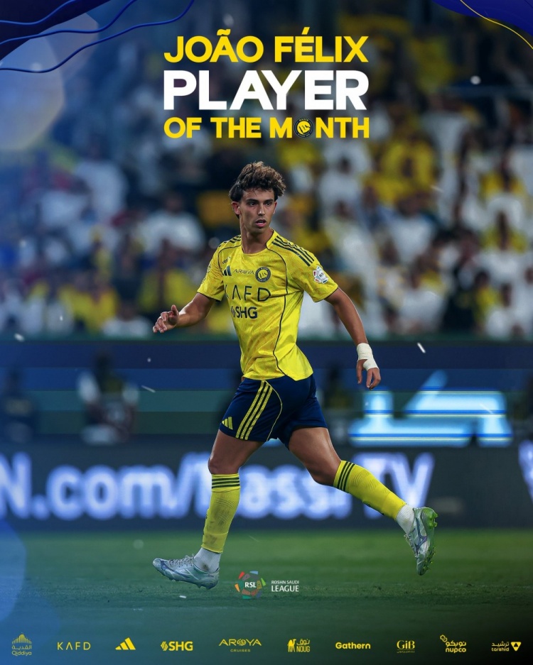 10月1日讯 官方消息,利雅得胜利前锋菲利克斯当选沙特联赛9月最佳球员。