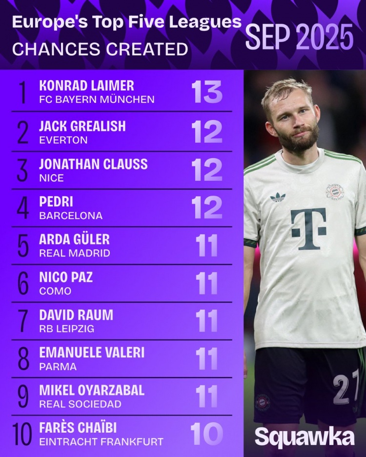 10月1日讯 Squawka统计了欧洲五大联赛球员在9月份的创造机会次数榜单,拜仁后卫莱默尔位列第一。