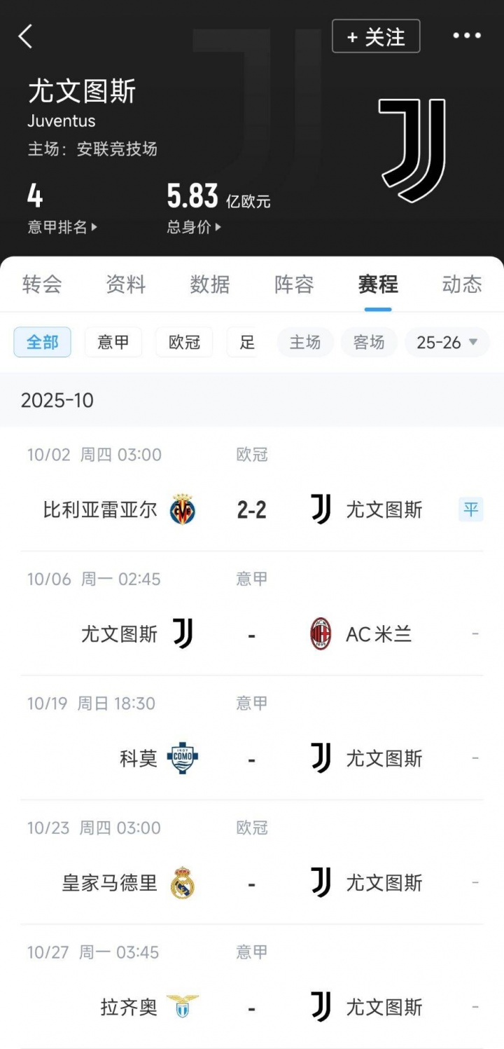 10月02日讯 欧冠比赛,尤文2-2遭比利亚雷亚尔绝平,各项赛事4连平,新赛季开始至今不败。