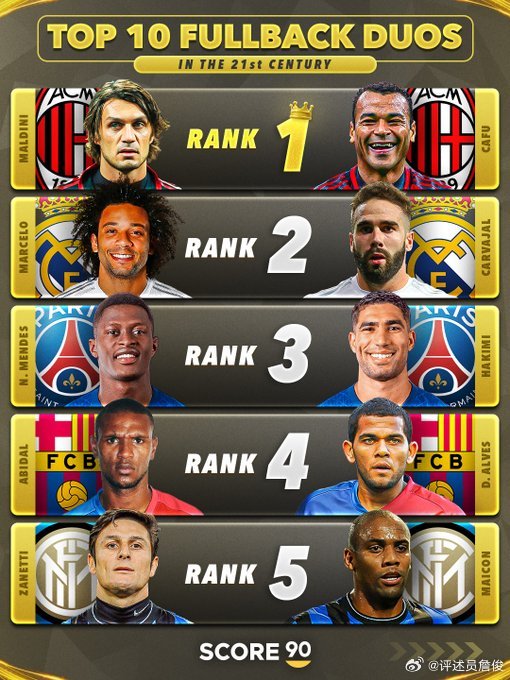詹俊对此写道:外媒评选的21世纪以来最强的五对双边卫组合,大伙觉得如何? 欧冠奖杯荣誉第二对最多,但论实力第一对太强了!如果只是比拼速度,第三对无人可及.............