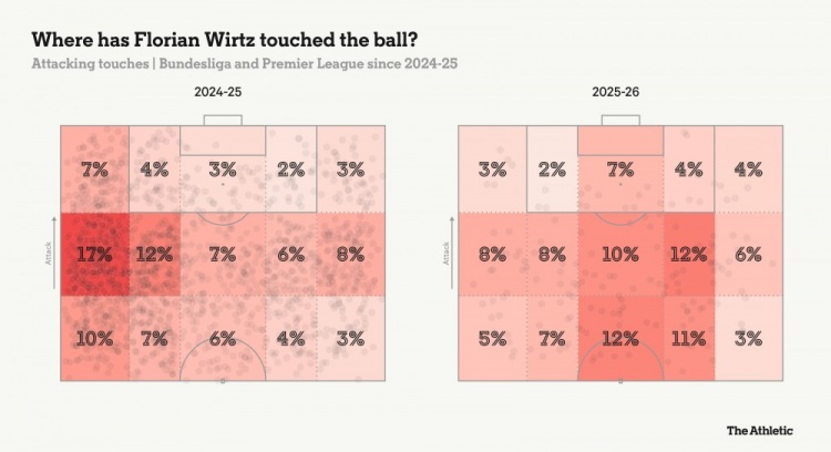 上赛季与本赛季,维尔茨场上触球位置的对比