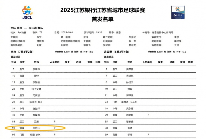 10月04日讯 “苏超”首场1/4淘汰赛,南京队对阵连云港队的首发已经公布,其中南京队派出了现效力于青岛海牛队的冯伯元首发出场。