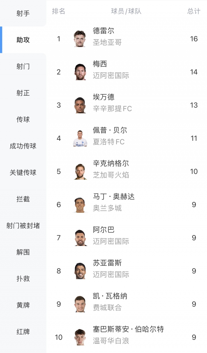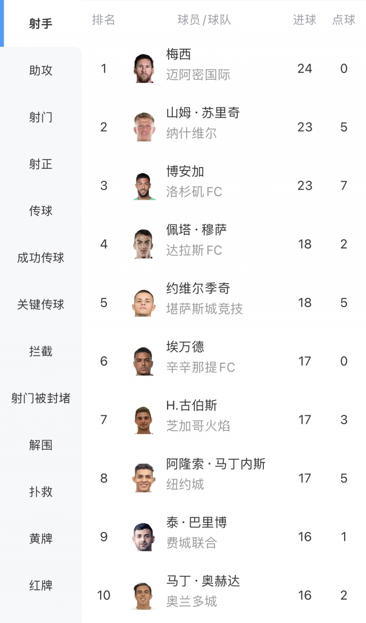 美职联迈阿密4-1新英格兰革命,梅西助攻戴帽,本赛季联赛14助,升至助攻榜第二位。射手榜方面,梅西以24球0点球排名第一。