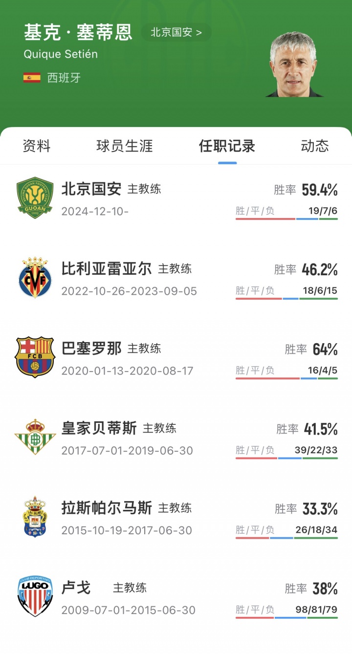 本赛季塞蒂恩执教北京国安,客战山东泰山0-6惨败,追平执教生涯第二大比分失利(2014年执教卢戈也曾0-6不敌赫罗纳)。