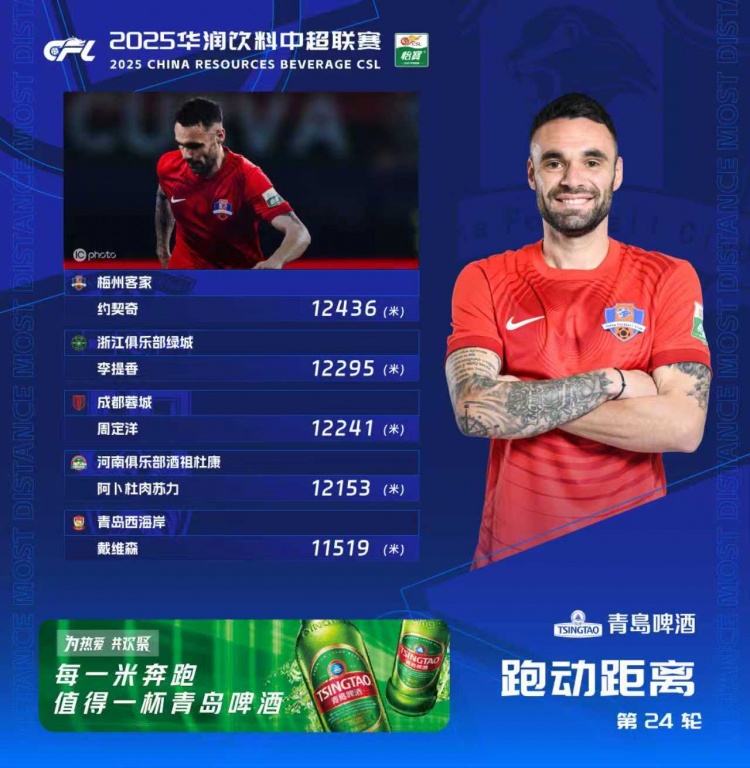 10月5日讯 中超联赛第24轮的补赛结束后,官方公布了本轮的跑动距离榜。排在本轮跑动榜榜首的是梅州客家外援约契奇,他的跑动距离为12436米。
