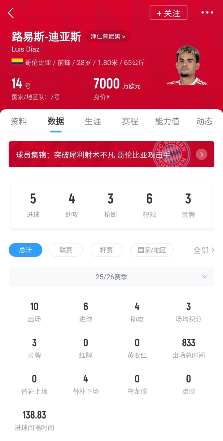 10月07日讯 德甲第6轮,拜仁3-0击败法兰克福,迪亚斯2射1传独造3球,加盟拜仁以来10场贡献6球4助。The Athletic点评了这笔曾备受争议的转会。