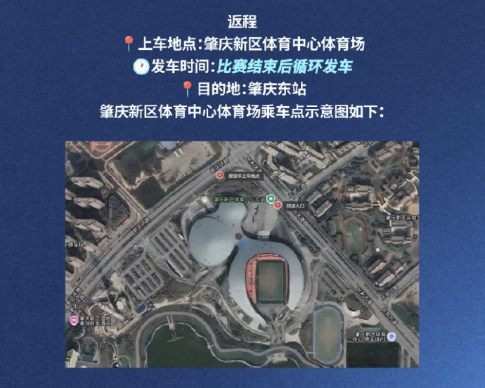 为方便乘坐高铁或动车抵达的球迷前往观赛俱乐部特别安排由肇庆东站往返肇庆新区体育中心体育场的免费接驳车服务。