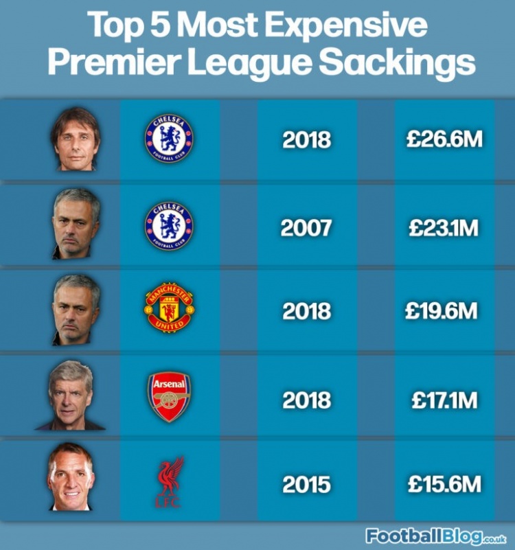 在所有解雇费用超过1000万英镑的18个案例中,有8个由切尔西制造,这进一步凸显了他们在教练席变动上的巨大投入。