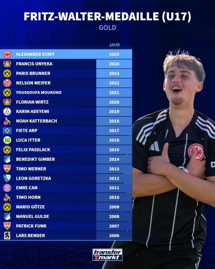 10月17日讯 法兰克福前锋斯塔夫当选德国U17年度最佳新秀,德国转会市场列出了历届德国U17年度最佳新秀名单。