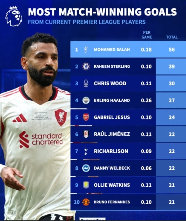 10月18日讯 德国转会市场盘点了现役英超球员打进制胜球排行情况,萨拉赫以56球遥遥领先,斯特林以39球位居次席。
