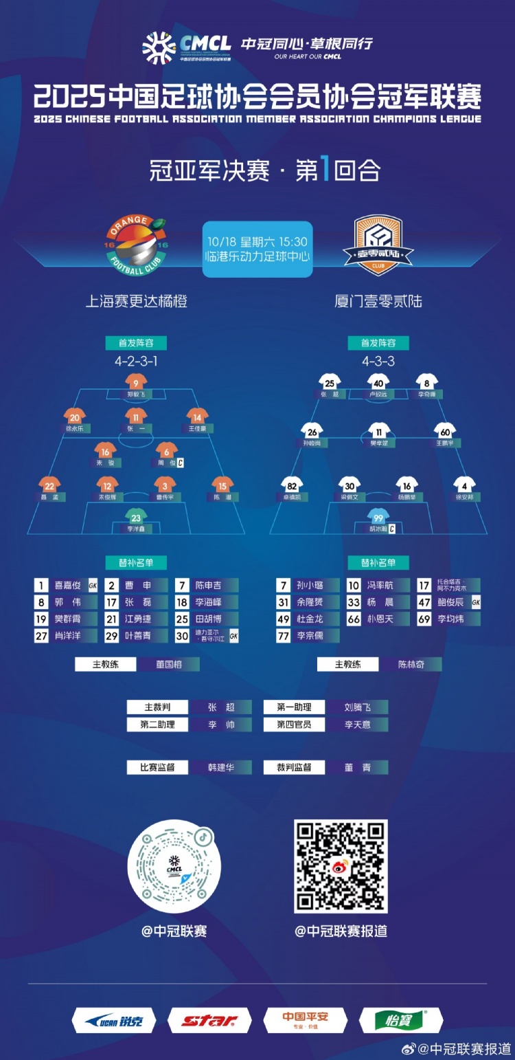 10月18日讯 今天下午15:30将迎来上海赛更达橘橙vs厦门壹零贰陆的中冠冠亚军决赛首回合比赛,59岁的投资人朱骏代表上海赛更达橘橙首发登场。