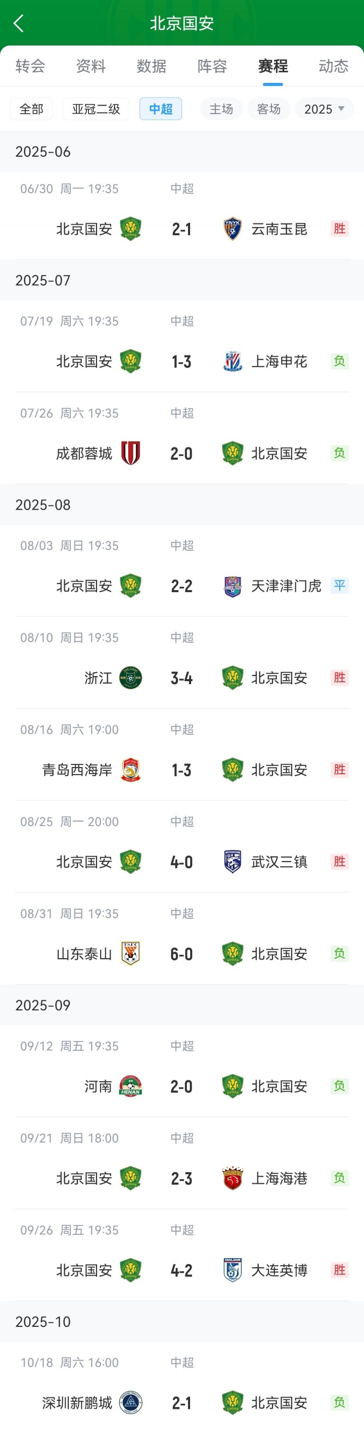 进入联赛下半程,国安在已经进行的12场比赛中战绩5胜1平6负,输球场次占据了一半,先后不敌申花、蓉城、泰山、河南、海港、新鹏城。10月5日,国安主帅塞蒂恩下课,如今临时主帅拉米罗也未能带队挽回颓势。