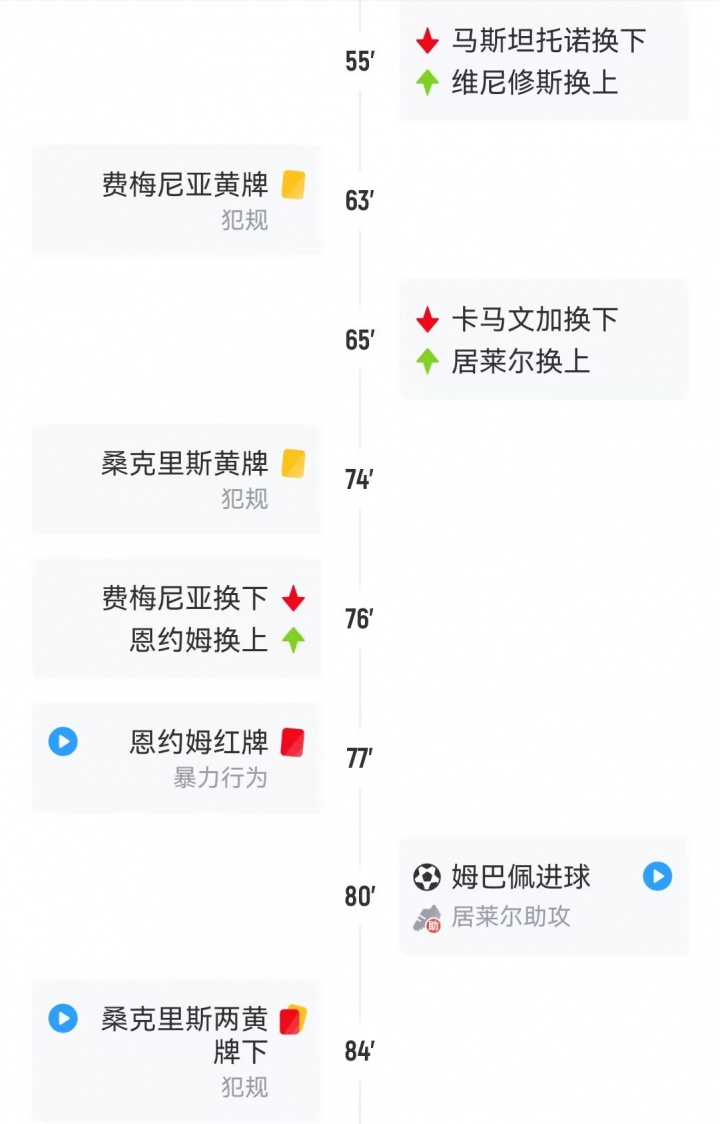 第77分钟,同样是替补登场的恩约姆刚上场1分钟,就因对维尼修斯犯规被主裁直红罚下。