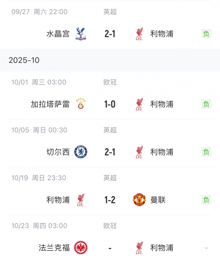 10月20日讯 利物浦主场1-2不敌曼联,遭遇各项赛事4连败,而如果周中欧冠客场再负法兰克福,利物浦将遭遇自1953年9月以来的首次五连败。