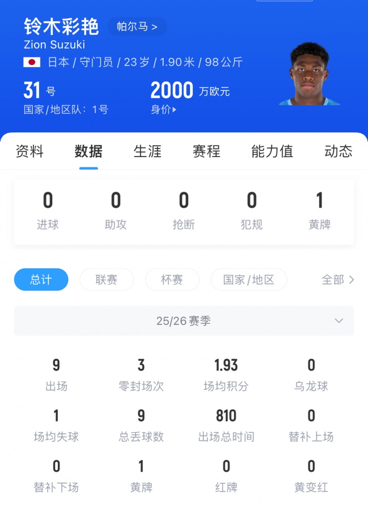 意甲第7轮,十人帕尔马0-0战平热那亚,本场比赛日本门将铃木彩艳单场7次扑救力保球门不失,同时补时扑点立下大功。