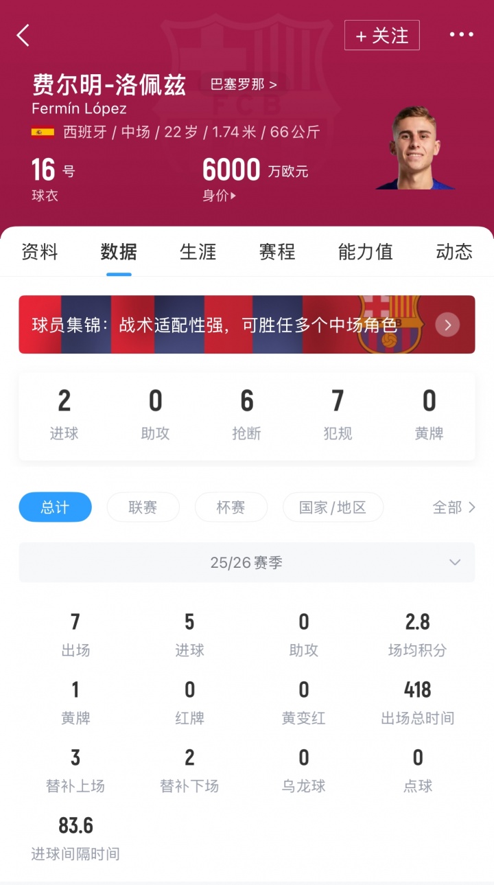 费尔明现年22岁,本赛季代表巴萨出场7次,打进5球。德转最新身价为6000万欧。