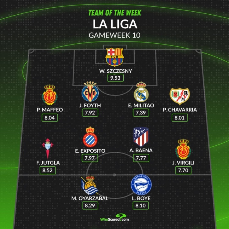 后卫:马菲奥(马洛卡,8.04分)、福伊特(比利亚雷亚尔,7.92分)、米利唐(皇家马德里,7.39分)、佩普-查瓦利亚(巴列卡诺,8.01分)