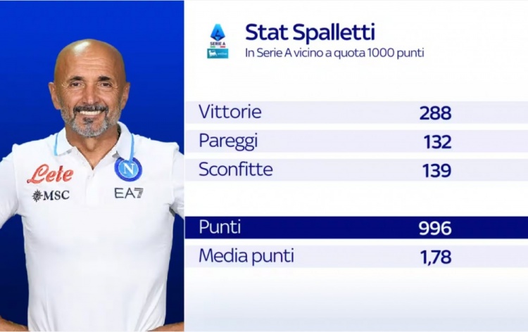 数据统计显示,斯帕莱蒂共计在意甲取得288胜、132平、139负,总积分996分、场均积分1.78分。