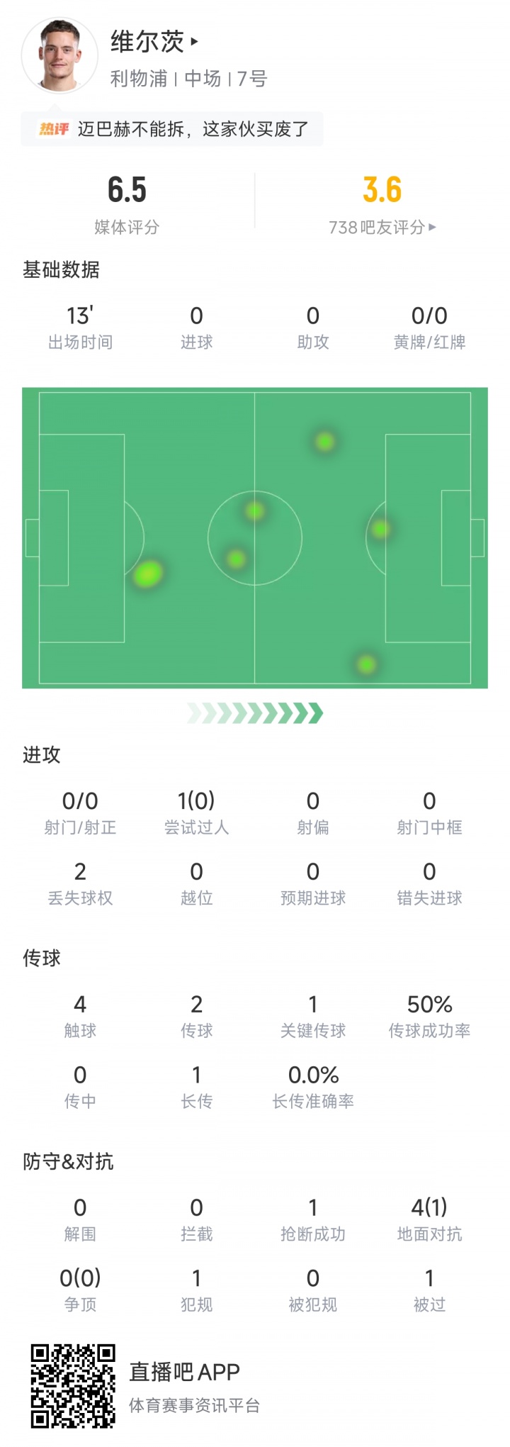 从第77分钟出场到伤停补时第4分钟结束,维尔茨一共出战17分钟,共计4次触球2丢球权,1次长传1次穿裆被过,4次对抗1成功。具体数据如下: