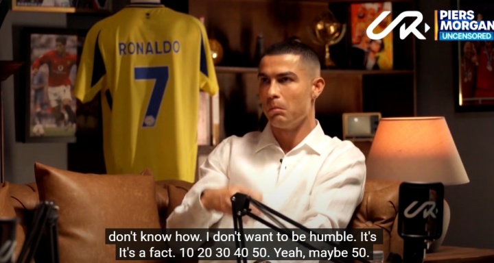 C罗: 当你谈论关于你(自己)时很困难。但正如我之前告诉你的,这是我所感觉的。我不在乎。你了解我。我不在乎人们怎么想我,如果他们说我疯了,说我傲慢。我不在乎。老实说,在40岁时,有五个孩子,拥有有史以来最好的朋友。我有一个他们帮助我很多的团队。公众舆论对我来说不再重要了。