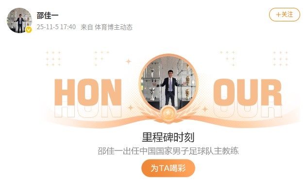 邵佳一的个人微博更新了他新的里程碑时刻:邵佳一出任中国国家男子足球队主教练。