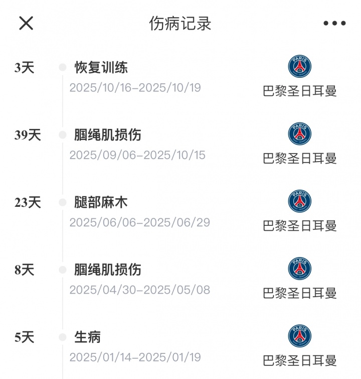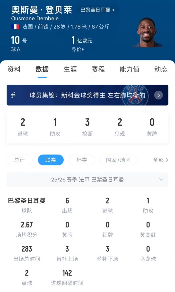 这是28岁的登贝莱本赛季第三次受伤,他本赛季已经缺席了16场比赛中的7场,伤缺44天。他本赛季至今仅为巴黎出战6场法甲、2场欧冠和1场欧超杯,贡献3球2助,共计425分钟,其中仅在欧超杯打满全场。