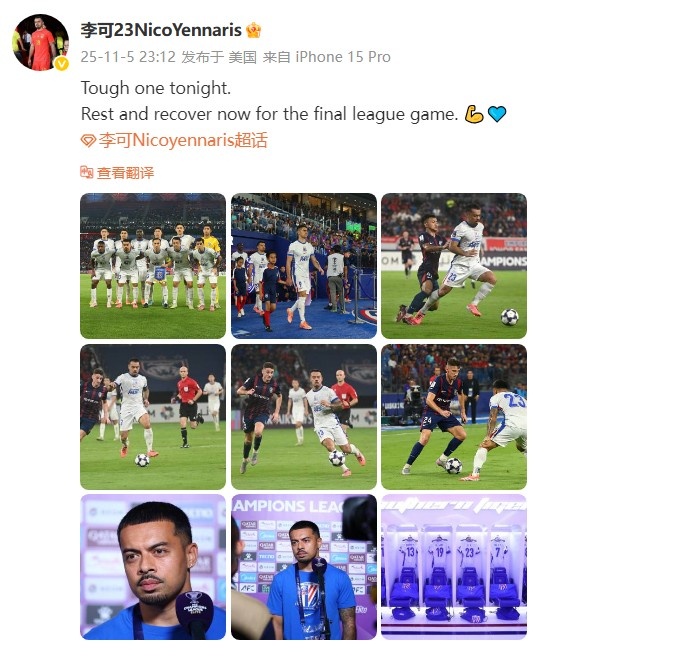 11月5日讯 亚冠精英联赛第4轮,上海申花客场1-3不敌柔佛新山。赛后,上海申花球员李可在社媒分享比赛照片。