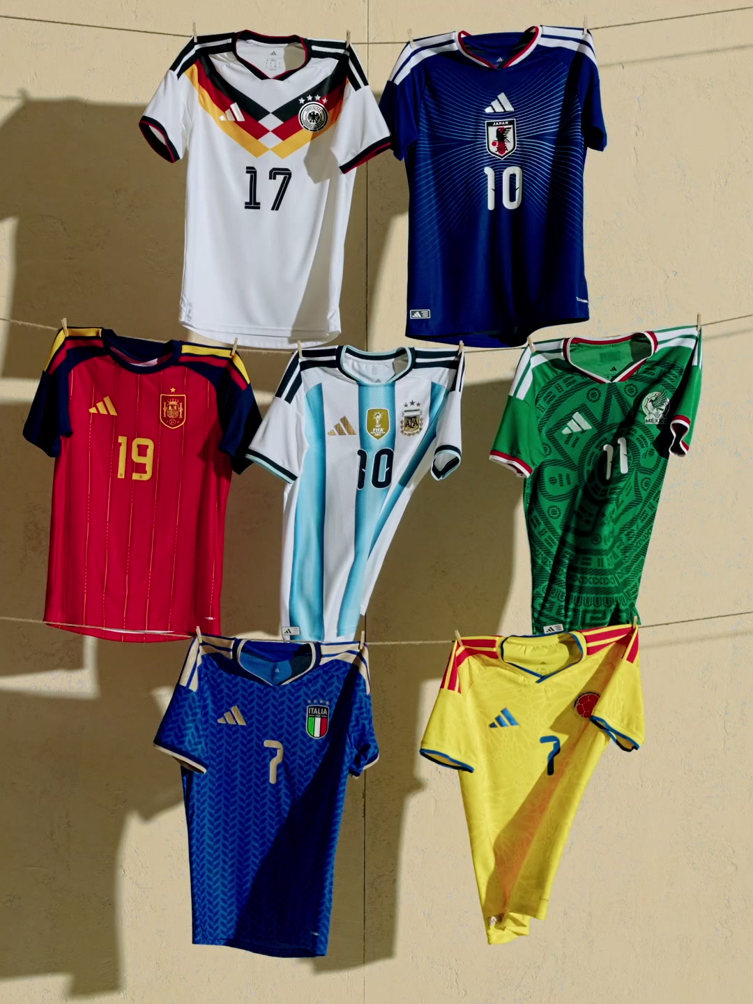 这22支球队分别是:阿尔及利亚、阿根廷、阿拉伯联合酋长国、北爱尔兰、比利时、秘鲁、德国、哥伦比亚、哥斯达黎加、卡塔尔、墨西哥、日本、瑞典、沙特阿拉伯、苏格兰、威尔士、委内瑞拉、乌克兰、西班牙、匈牙利、意大利、智利。[ 牙买加队主场球衣将于2026年单独发布。]