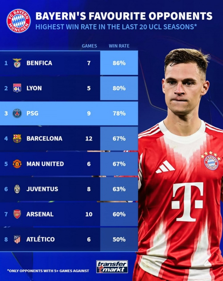 11月5日讯 在本轮欧冠,拜仁2-1击败巴黎,德转也统计了拜仁在近20个赛季欧冠对阵胜率最高的对手(至少5次对阵),具体如下: