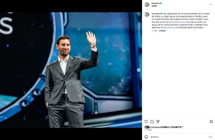 梅西写道:非常感谢迈阿密市的认可,这个地方对我和我的家人来说都非常特别。从第一天起,这里的人们就让我们感到无比温暖,就像今天在商业论坛现场一样,我们再次感受到了这座美丽城市居民的热情和支持。同时,我也要感谢迈阿密国际俱乐部及球迷一直以来的支持。