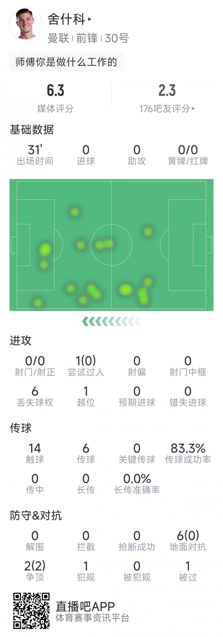 11月8日讯 在本轮英超曼联对阵热刺的比赛中,舍什科下半场58分钟替补登场,88分钟又因伤下场,以下为他在本场数据: