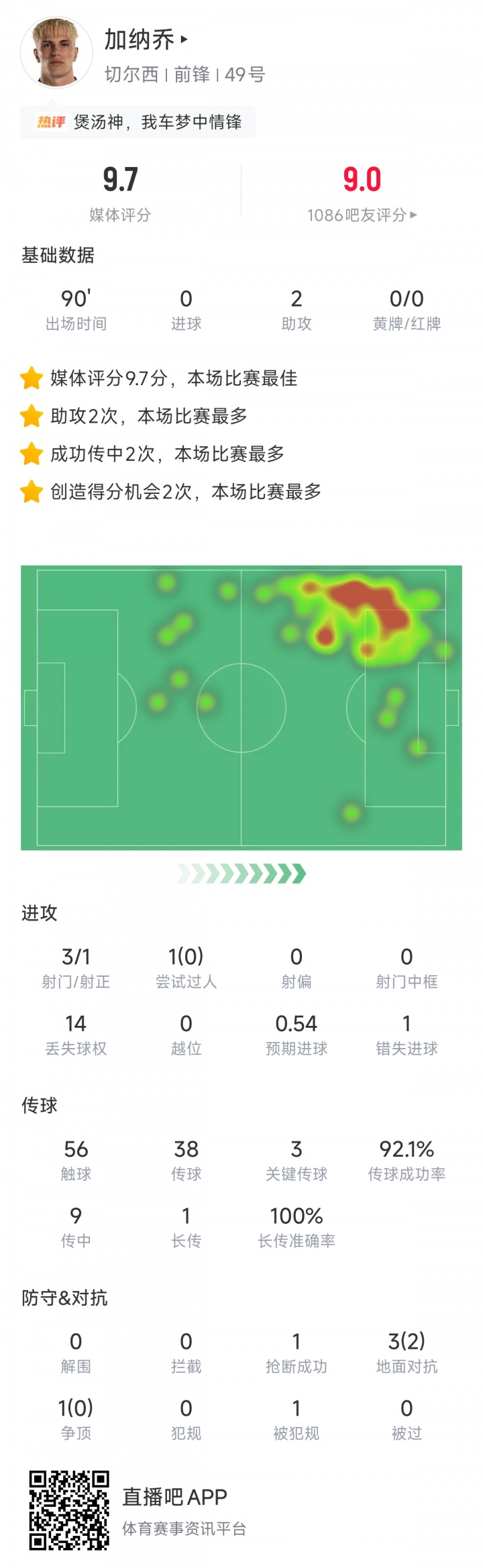 21岁的加纳乔刚加盟切尔西时适应得一般,表现并不算差但奈何前6场比赛数据0球0助。好在加纳乔近期渐入佳境,坐稳首发的他近4场比赛2球2助,本场比赛更是拿到9.7的超高评分,全场第1。他此役56次触球14次丢球权,传球38次成功率92.1%,3次关键传球2次助攻,9次传中。