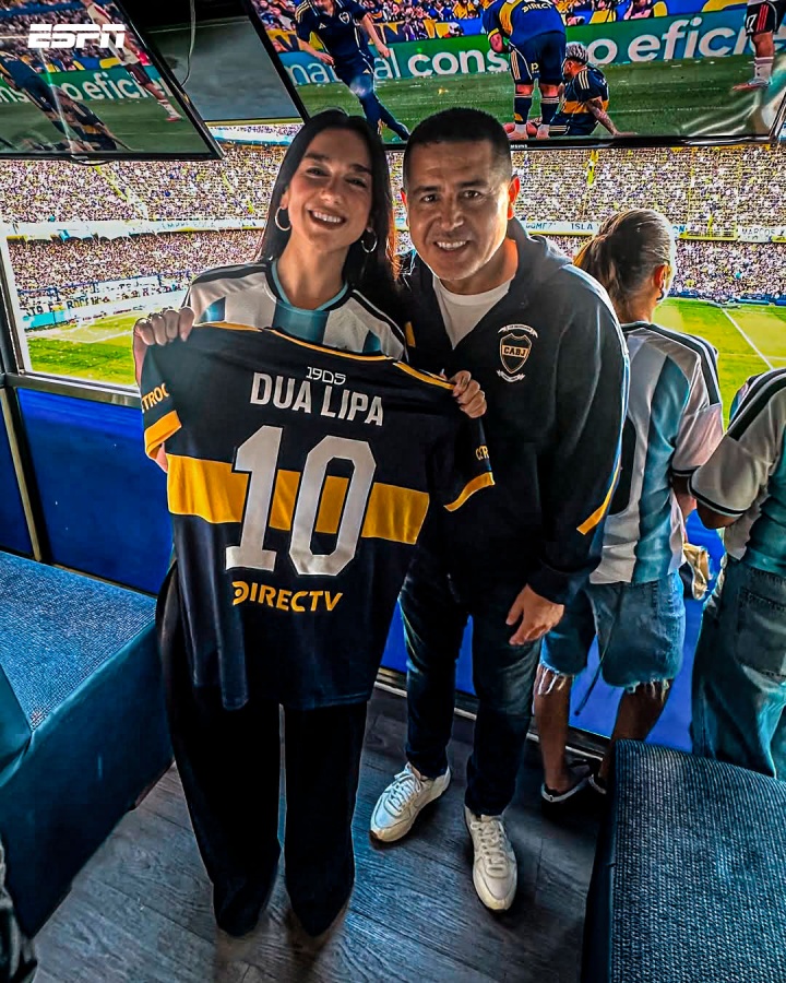 正在阿根廷布宜诺斯艾利斯举行演唱会的啪姐Dua Lipa现场观战博卡青年vs河床的比赛,身着阿根廷最新国家队战袍,并与里克尔梅合影。