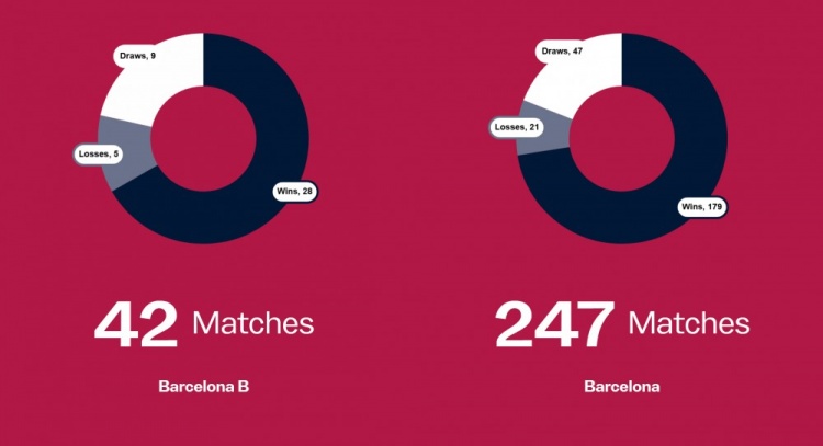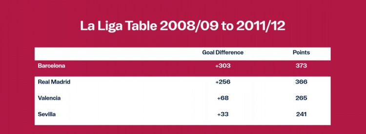 “克鲁伊夫在报纸上写了一篇专栏文章,告诉球迷不必担心,因为他们踢得非常好,只是运气不佳。从那里展开的一切证明他是正确的。”08/09赛季,瓜迪奥拉带领巴萨赢得了史无前例的三冠王,但这仅仅是个开始。在接下来的四年里,巴萨豪取十四个重要奖杯,包括三次西甲冠军和两次欧冠冠军。更令人惊叹的是球队展现出的恐怖统治力——在那四个赛季里,巴萨在联赛中豪取373分,净胜球达到惊人的303个。在他执教的247场比赛中,胜率高达72.5%,这是一个近乎梦幻的数字。