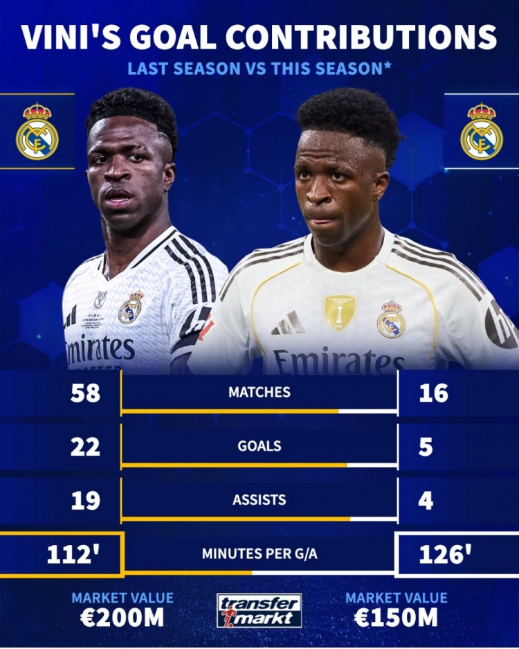 11月11日讯 德国转会市场统计了维尼修斯上赛季和本赛季的数据,这位皇马前锋的效率有所下滑。