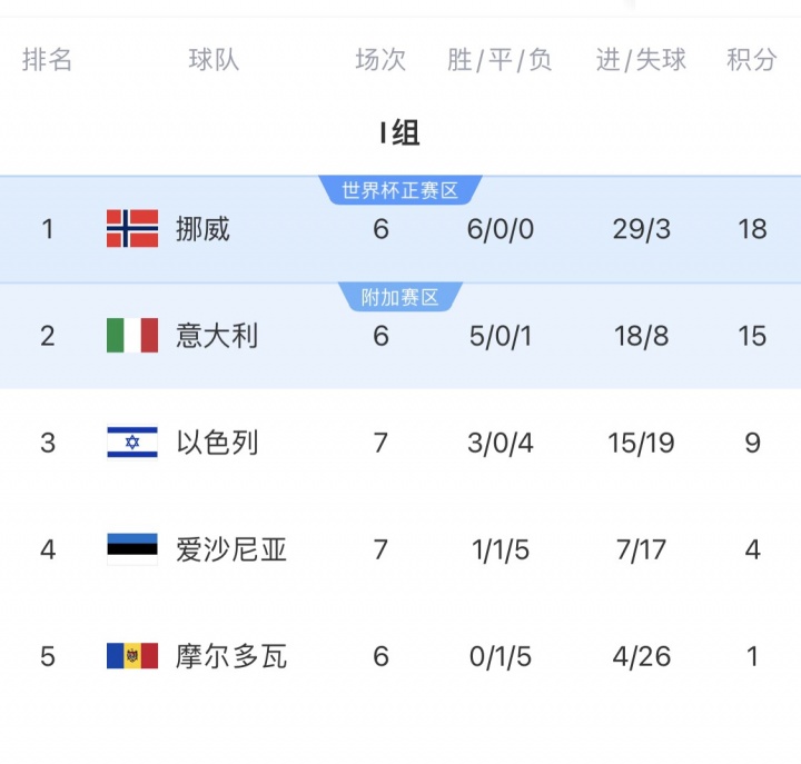本届世预赛,挪威6战全胜进29球丢3球,净胜球26球,比第二名意大利整整多出了16个净胜球。