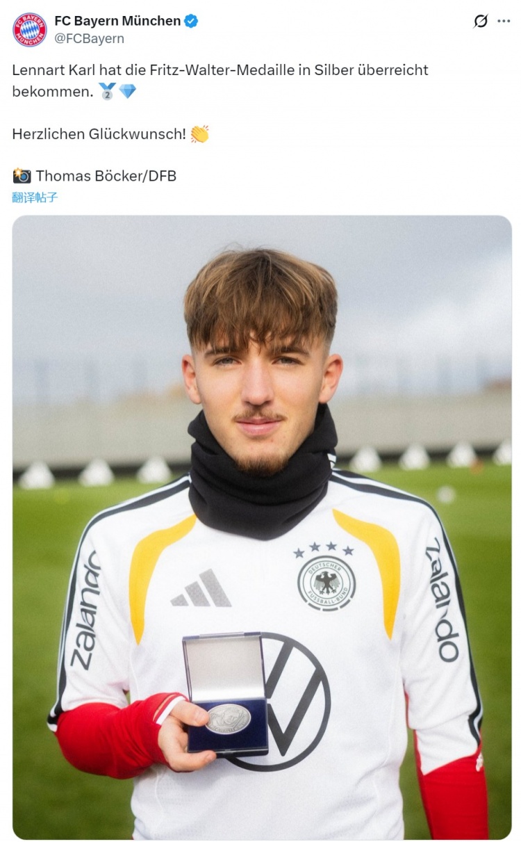 卡尔获得德国足协颁发的弗里茨·瓦尔特银质奖章,拜仁官方社媒晒出这位小将展示奖章的照片,对他表示祝贺。