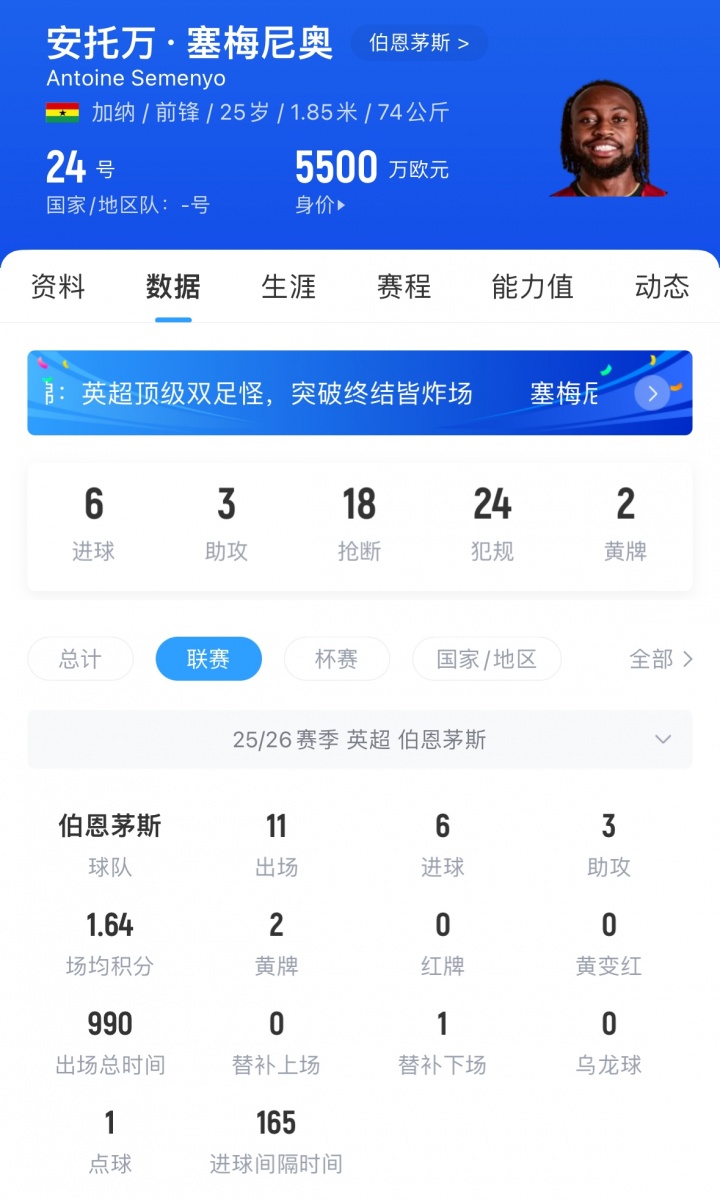 塞梅尼奥现年25岁,司职前锋,他本赛季为伯恩茅斯出战11场英超,贡献6球3助,他与伯恩茅斯的合同将在2030年到期,现身价5500万欧。