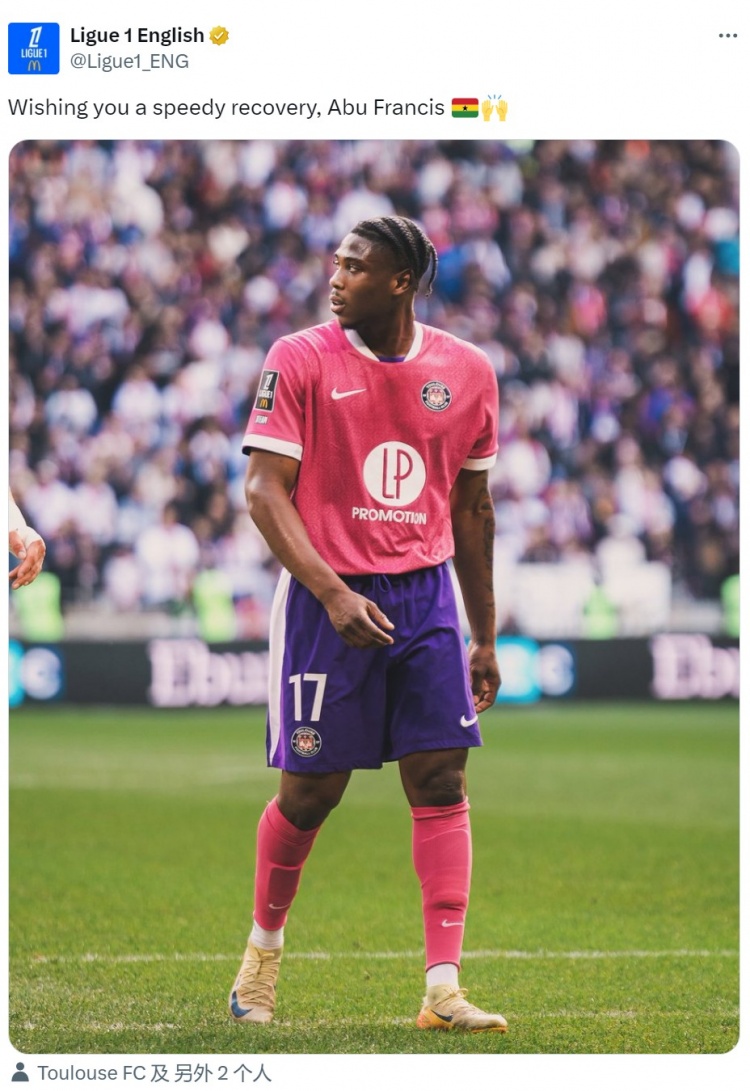 11月14日讯 法甲官方更新社媒动态,祝效力于图卢兹的加纳中场阿布·弗朗西斯早日康复。