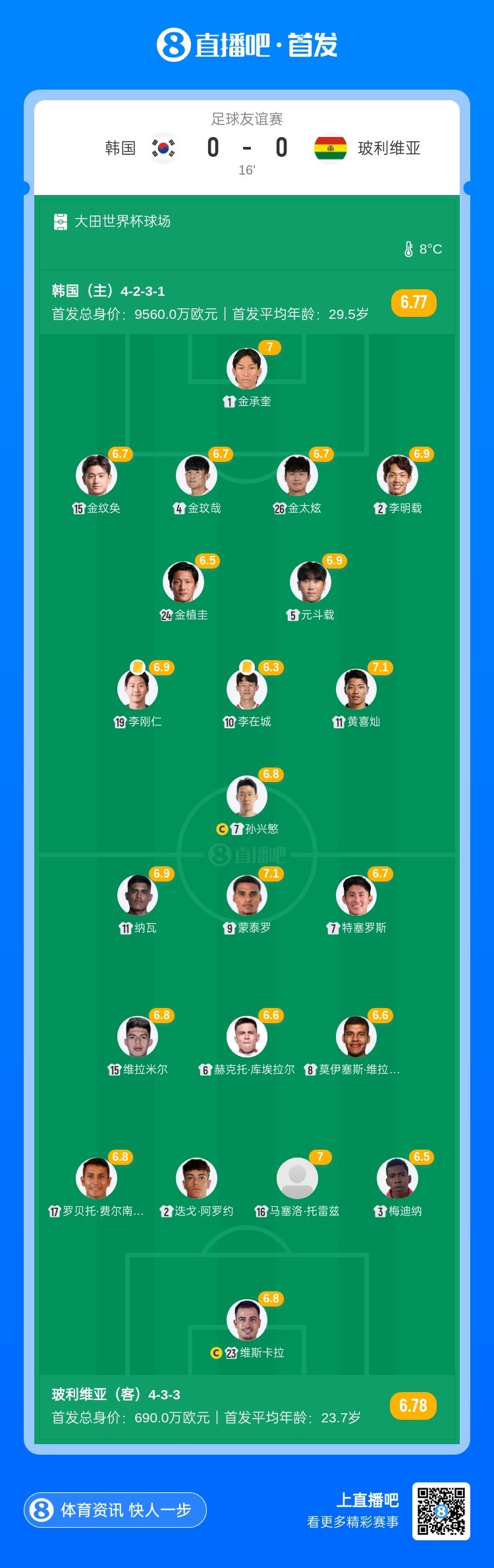半场-韩国暂0-0玻利维亚 金太炫送礼蒙泰罗失良机 李刚仁染黄