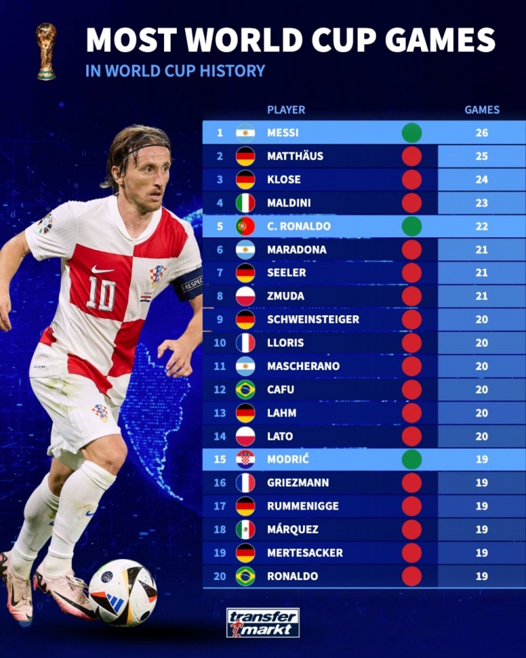 11月15日讯 克罗地亚获得世界杯参赛资格,莫德里奇将迎来第5届世界杯,德国转会市场统计了球员在世界杯的出场次数,并列出榜单,梅西26场居首,C罗22场、莫德里奇19场。