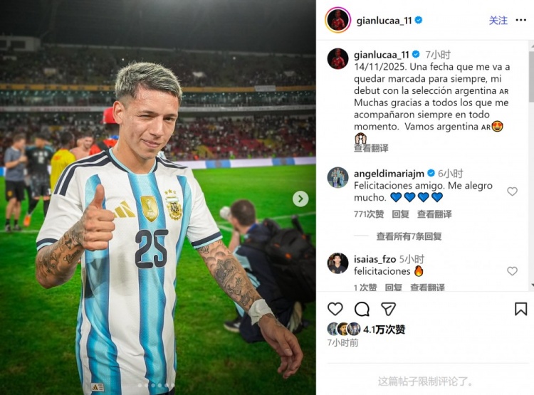 普雷斯蒂亚尼社媒晒出照片,庆祝完成阿根廷队首秀,配文:“2025年11月14日。这个日子将永远铭刻在我心中,我代表阿根廷国家队完成首秀。衷心感谢一路以来支持我的所有人,阿根廷加油!”